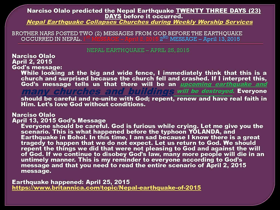 NEPAL EARTHQUAKE WRITTEN IN GOD'S MESSAGE, APRIL 2 & 13, 2015Narciso OlaloAug 6, 20181 min readCLICK HERE TO READ THE ACTUAL POST ON FACEBOOK-GOD'S MESSAGE